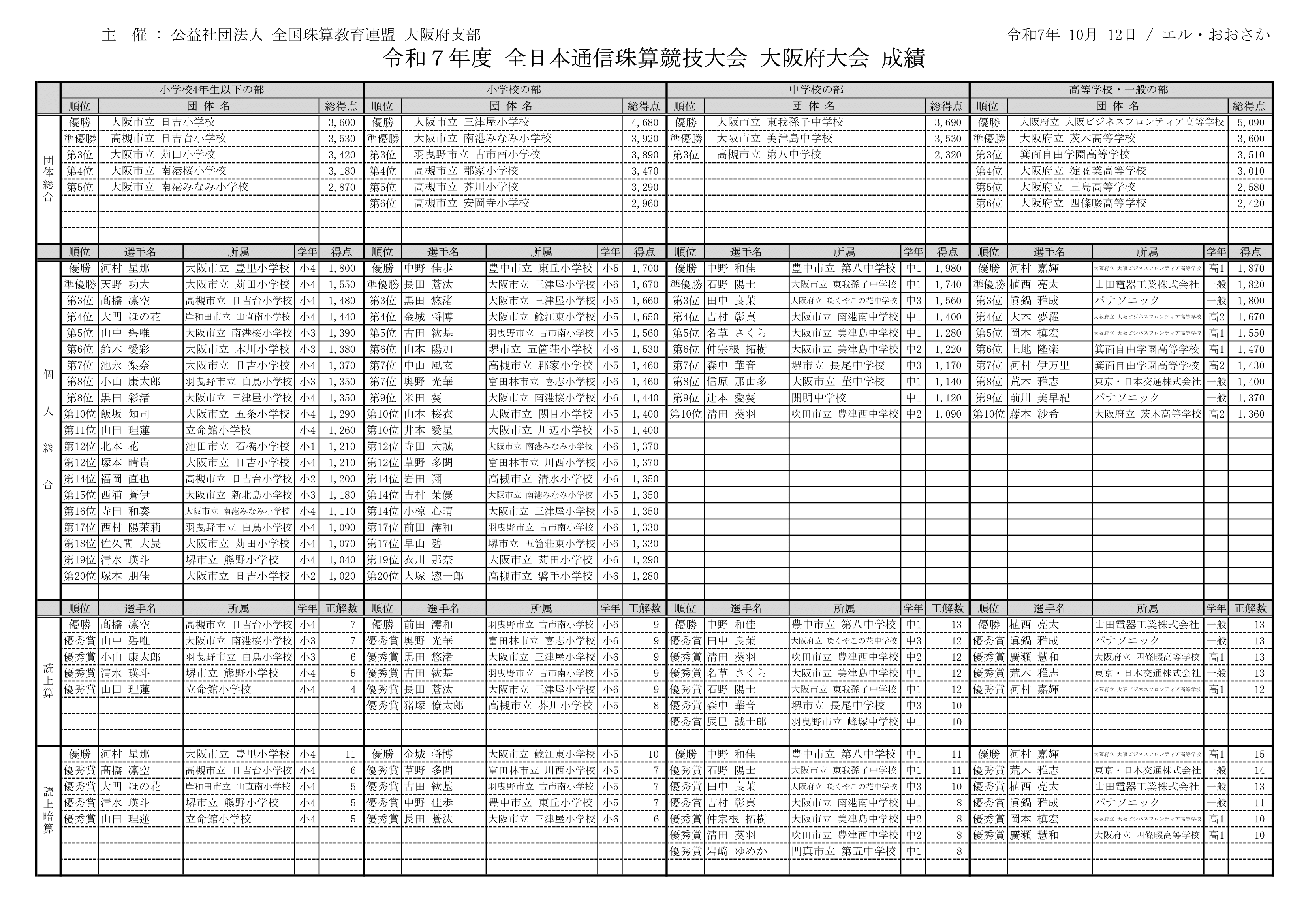 令和7年度 全日本通信珠算競技大会 大阪府大会 大会結果