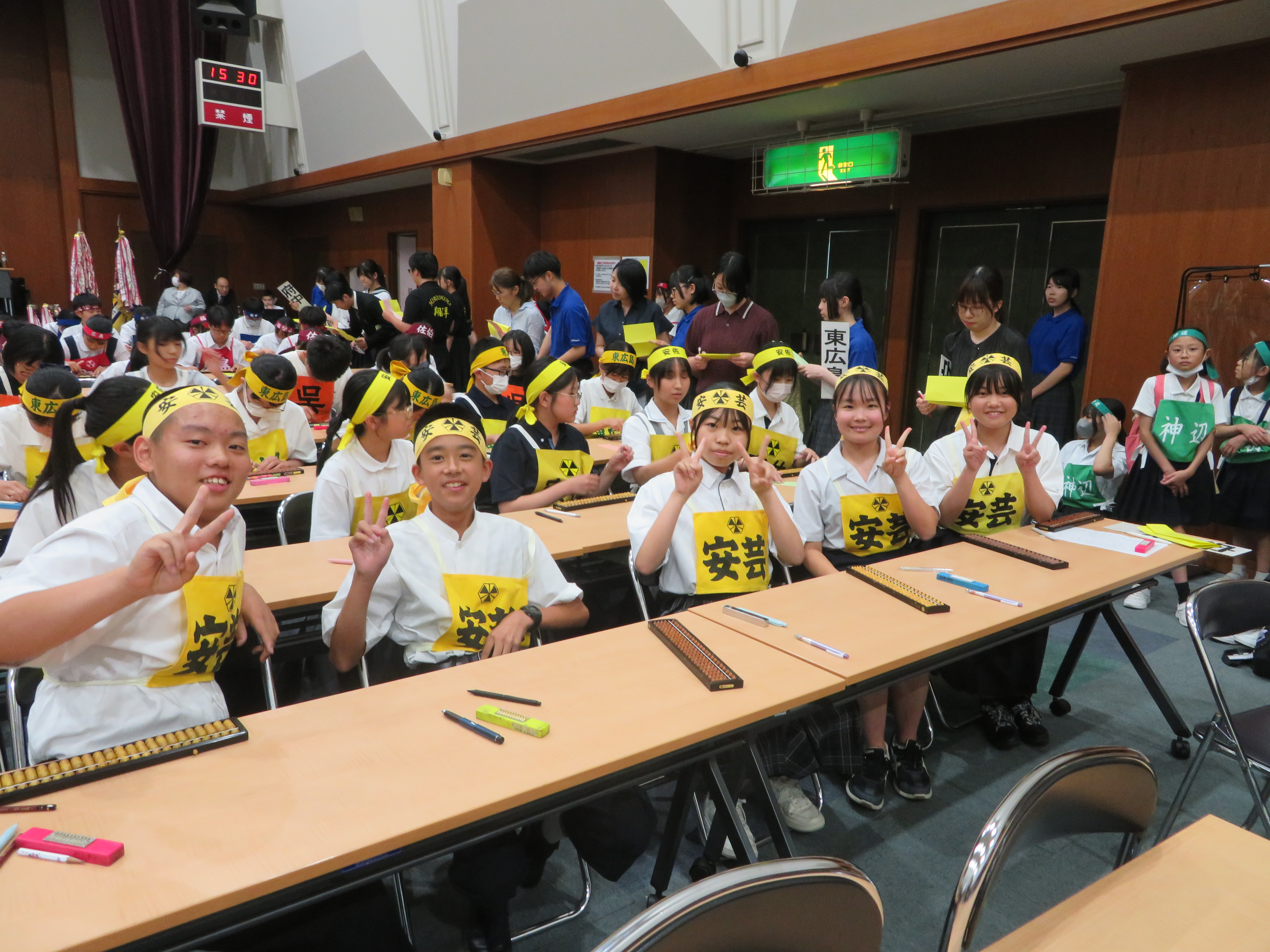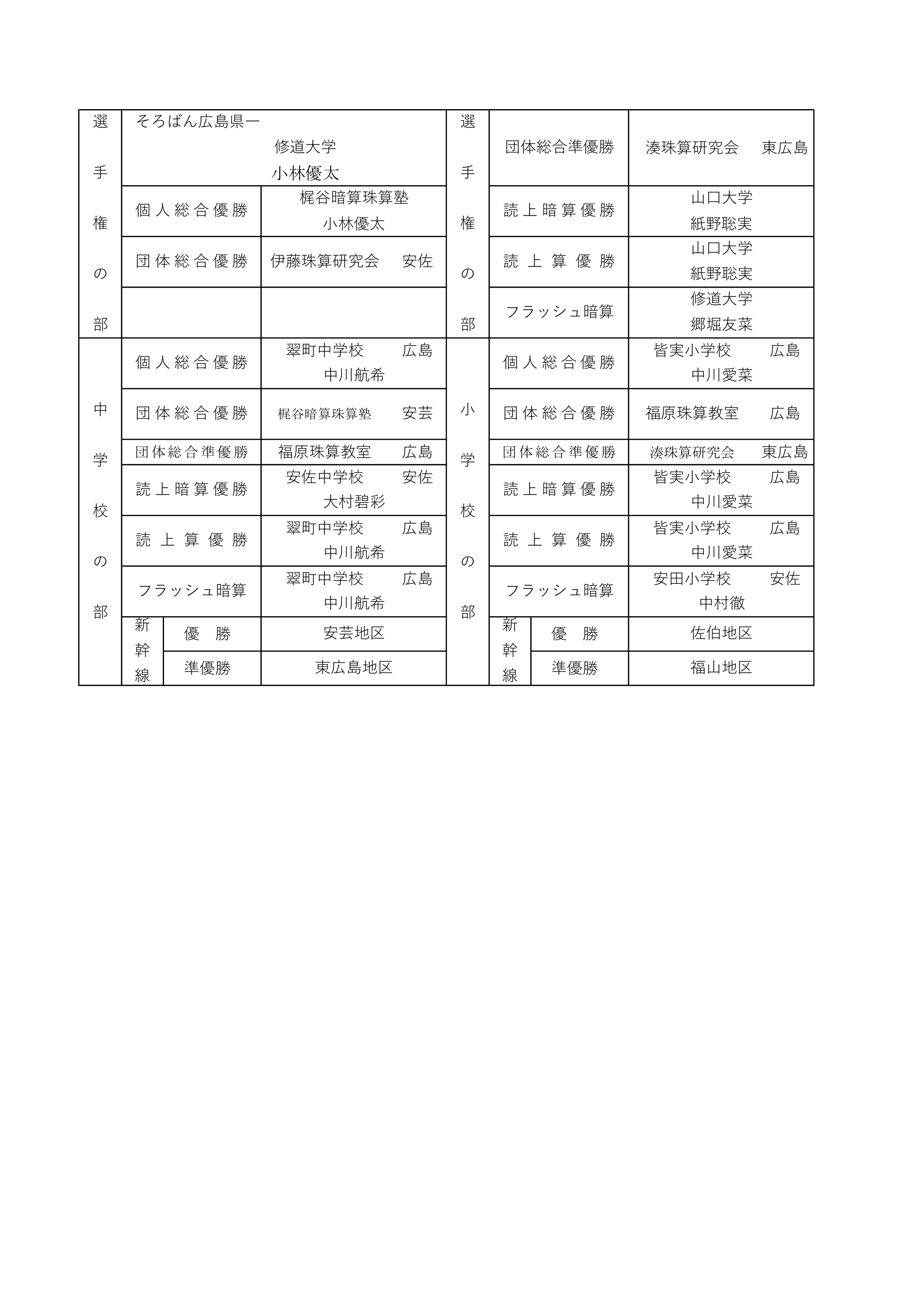 8月に広島県で行なわれる中国五県珠算選手権大会の出場権をかけた大会で、 各地区予選を勝ち抜いた小学校の部96名、中学校の部79名、選手権の部114名、合計205名が参加した。 3年連続で広島県一に小林優太選手が選ばれた。中国五県の代表に総勢50名が決定した。昨年の西山叶望名人と共に挑む。